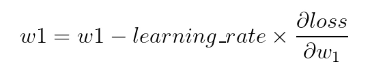 The equation above is known as gradient descent equation. Here, the learning_rate controls how much we want to increase or decrease w1. If the learning_rate is large, the update will be large. This could lead to w1 going past the red dot and therefore missing the optimal value. If this value is too small, it will take forever for w1 to reach the red dot. You can try experimenting with different values of learning rate to see which works the best. In general, small values like 0.01 works well for most cases.