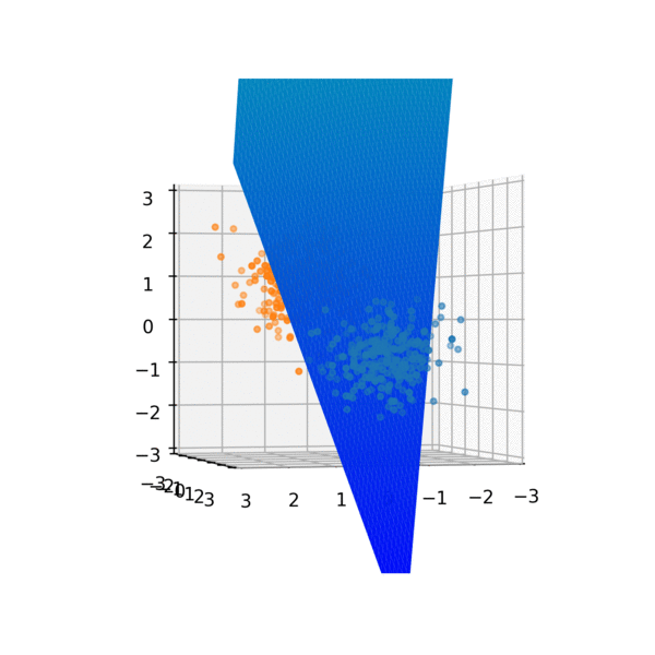 Remember that W and B are chosen randomly and so the 3D space will be squished onto a random line. The decision boundary for this transformation is the set of points that make f(x) = 0.5. Think why! As the 3D space is being squished onto a 1D line, a whole plane is mapped to the value 0.5 on the line. This plane is the decision boundary for f(x). Ideally, it should divide the dataset into two clusters but since W and B are randomly chosen, this plane is randomly oriented as shown below.