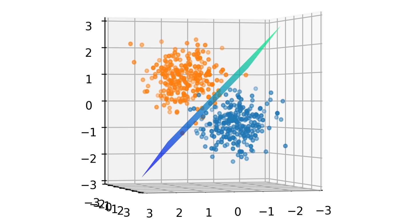 Now that we have our data ready, we can say that we have the x and y. We know that the dataset is linearly separable implying that there is a plane that can divide the dataset into the two clusters, but we don’t know what the equation of such an optimal plane is. For now, let’s just take a random plane.