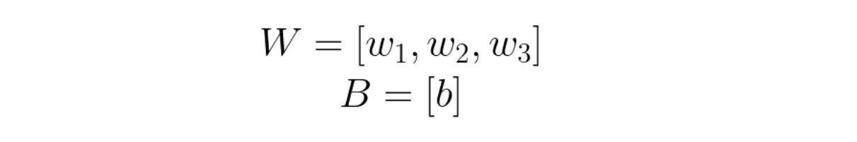 x: input tensor of shape (num_points, 3)W: Weight (parameter) of shape (3, 1) chosen randomlyB: Bias (parameter) of shape (1, 1) chosen randomlySigmoid: A function that maps values between 0 and 1