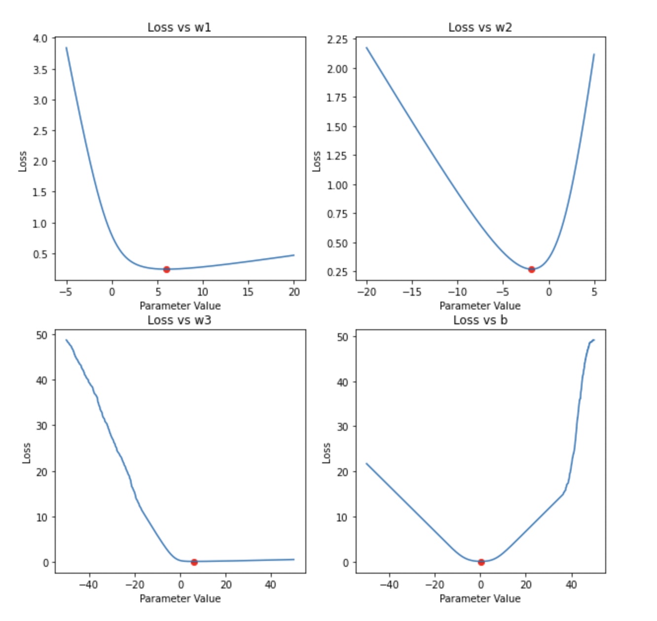Once we have the loss from forward-propagation, we will calculate the gradients of the loss function with respect to each variable in the classifier. If we plot the loss for different values of each parameter, we can see that the loss is minimum at a particular value for each parameter. I have plotted the loss vs parameter for each parameter.