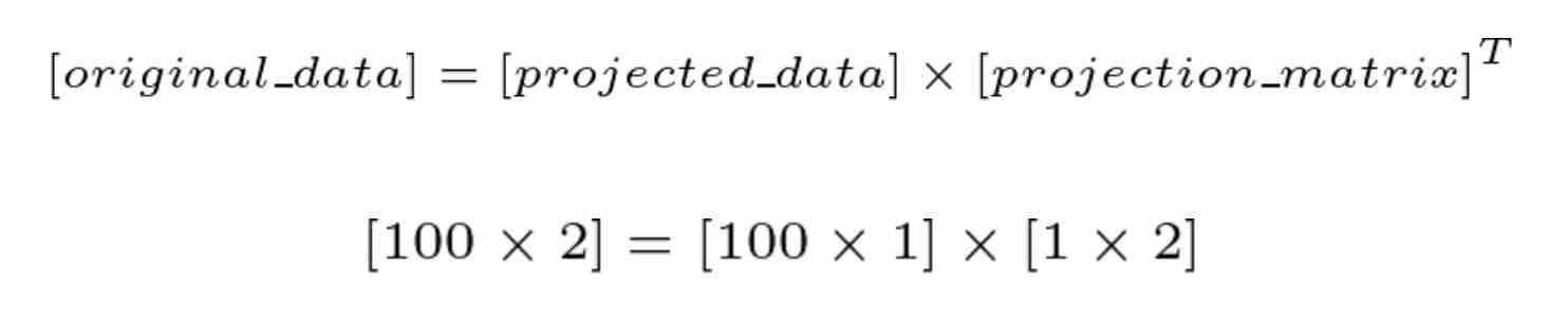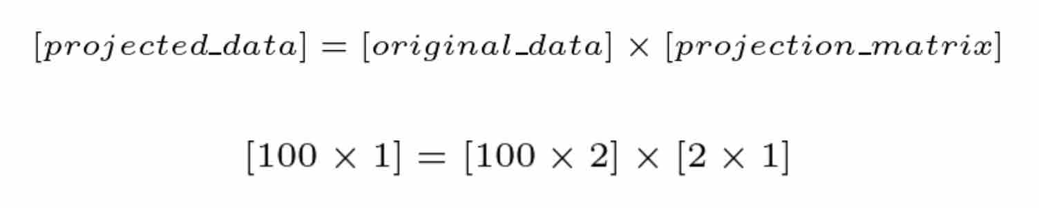 Now, reshape the first eigenvector (a-axis) into a 2x1 matrix, called the projection matrix. It will be used to project the original dataset of shape(100, 2) onto the new basis function (a-axis), thus compressing it to (100, 1).