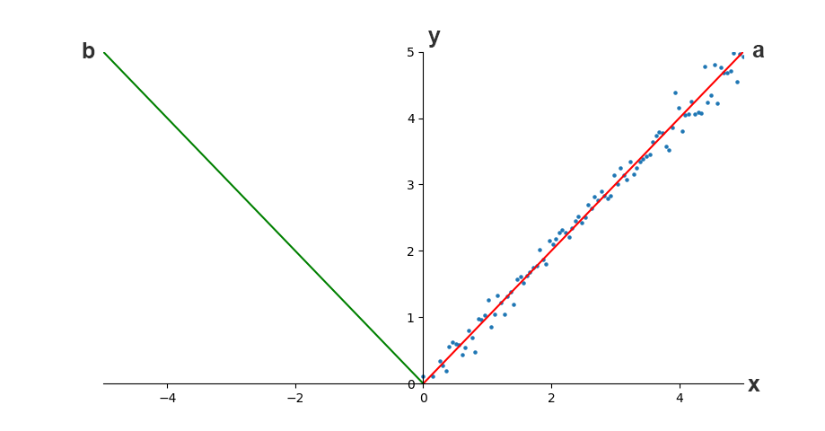 Now, let’s rotate the coordinate system such that the x-axis lies along the red line. Then, the y-axis (green line) will be perpendicular to this red line. Let’s call these new x and y axes as a-axis and b-axis respectively. This is shown below.